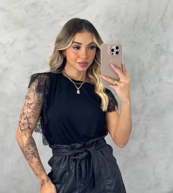 Regata de malha de algodão. O maior detalhe desse produto se encontra na renda das mangas, onde traz toda suavidade da peça. Esse básico que não pode faltar no nosso guarda-roupa abre espaço para a entrada de acessórios, assim você pode deixar uma imagem super elegante sem muito esforço.